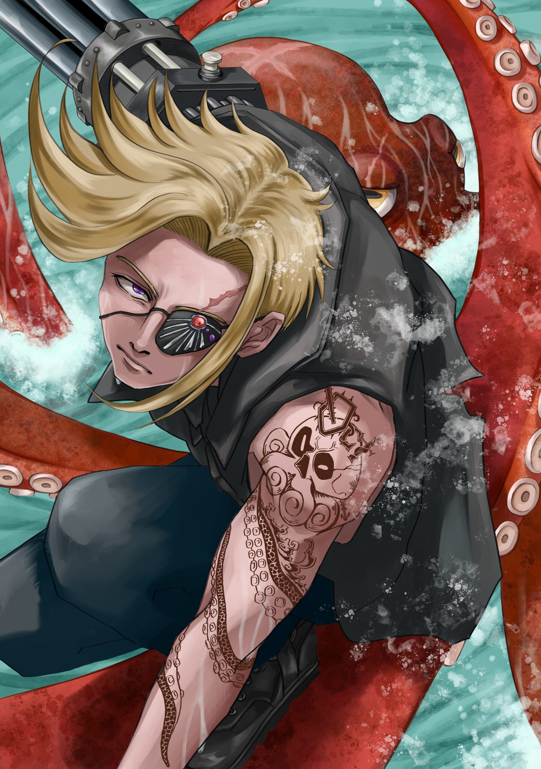 一応、タコをボスとする海専門のトレジャーハンター集団…という設定に落ち着いたのですが、描いてるうちにこのキャラクターを気に入ってしまい、別設定でこの後何枚かイラストを描いております。